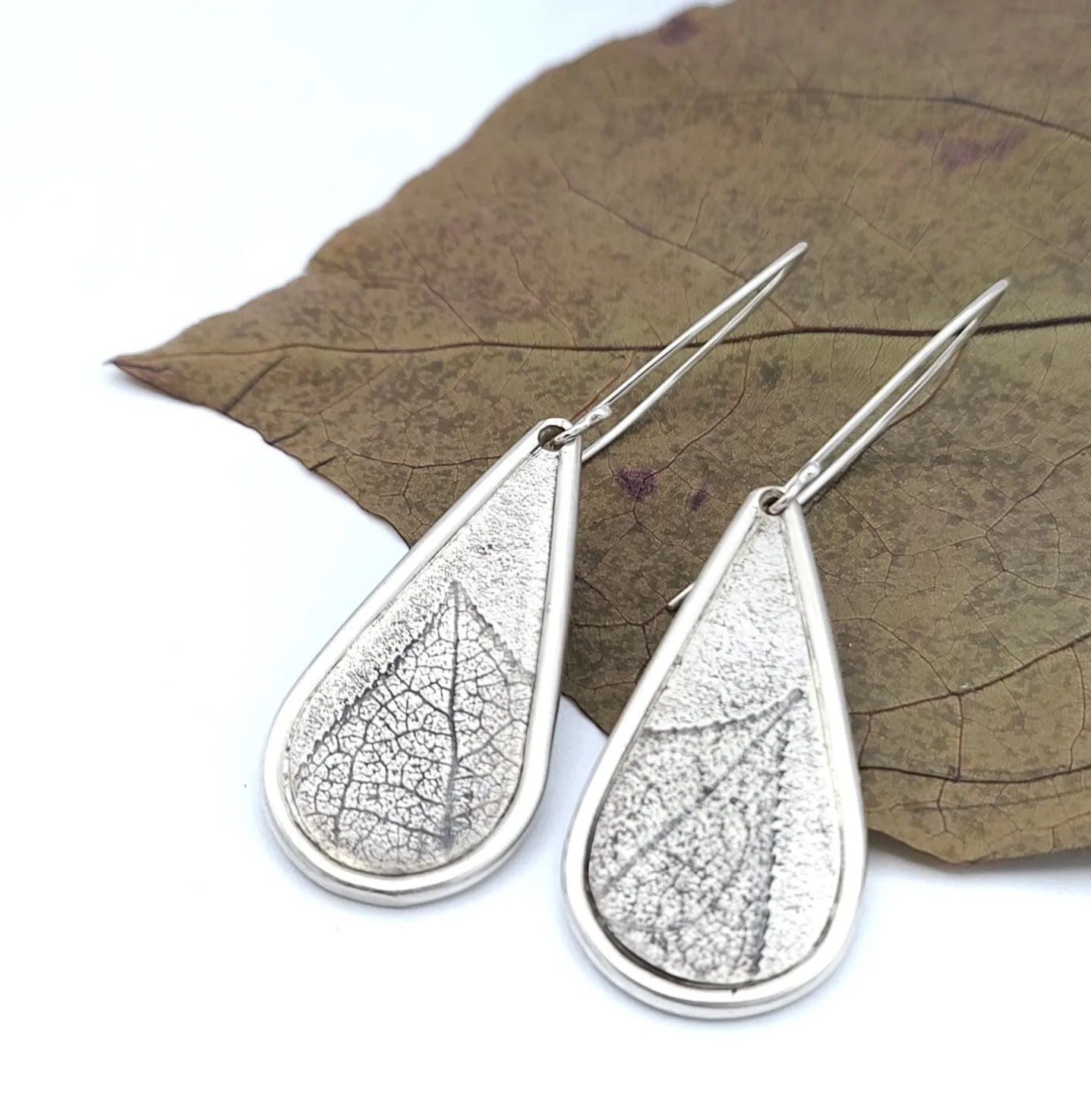 Sterling silver imprinted with foraged salal, after pressing and drying plants found on hikes and trips around Vancouver Island. Handmade ear wires. Recycled precious metals, as always. One-of-a-kind.